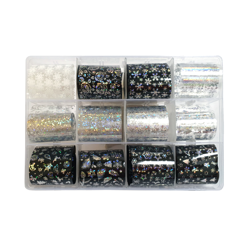 Zdobící stříbrné duhové fólie v boxu, ve kterém je 12ks fólií různých motivů.