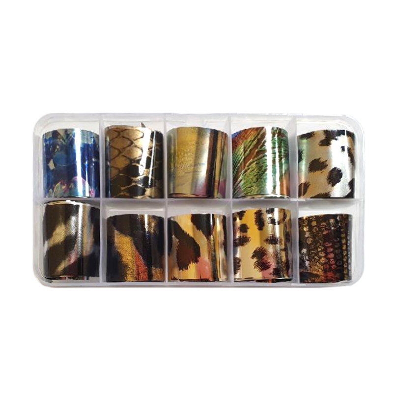 Zdobící fólie v boxu, ve kterém je 10ks fólií různých motivů.
