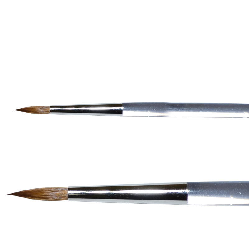 ŠTĚTEC č.4 - kulatý, špičatý, vhodný na gel i akryl, bezešvá stříbrná zděř, průhledné akrylové držátko, vlas Kolinsky-Rotmarder.