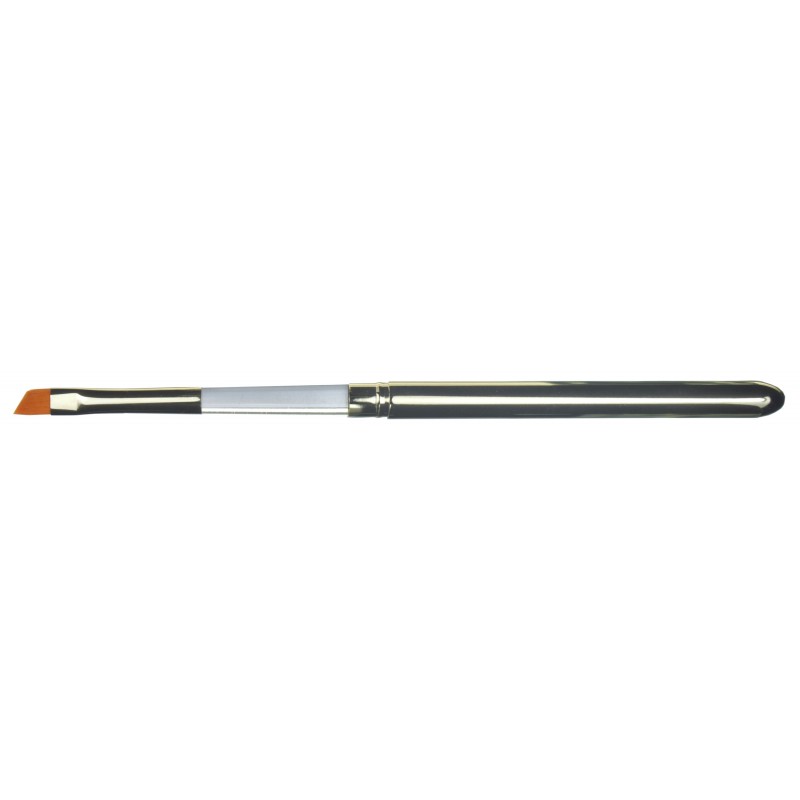 Štětec na nehty Kolinsky č.6 - plochý, zkosený, načervenalý syntetický vlas Gold Sable, ve stříbrné kovové skládací soupravě - ochranný kryt s otvorem a akrylátové držátko.