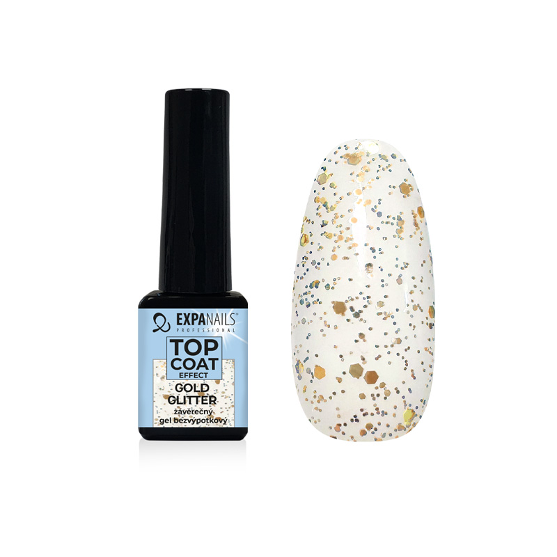 Závěrečný bezvýpotkový lesk, čirý se zlatými třpytkami, který je velmi pružný a efektový lesk. Oživí každou barvu a vytvoří na povrchu barevného gelu krásný třpytivý efekt.
