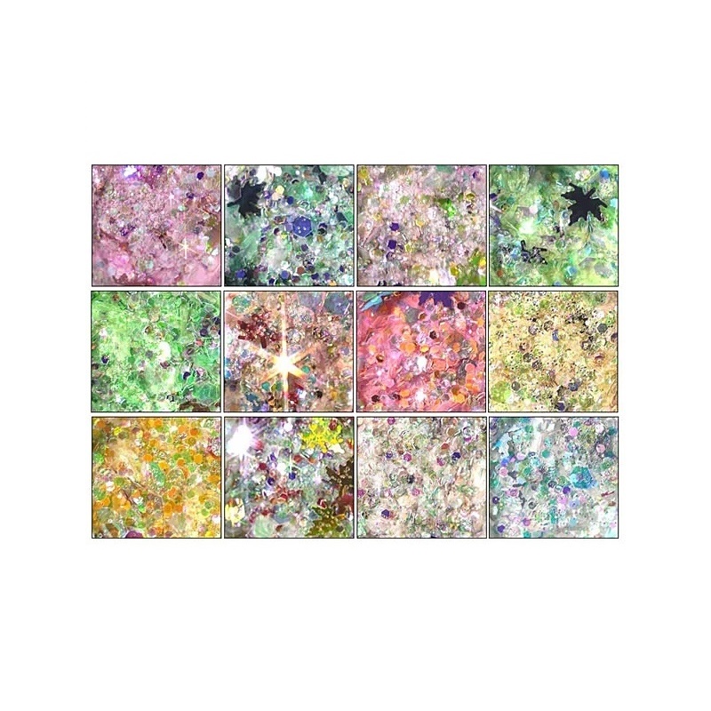 Mix zdobení ( lístky, hologramy a třpytky), které jsou vhodné na vkládání do gelu, akrylu nebo Poly akrygelu.